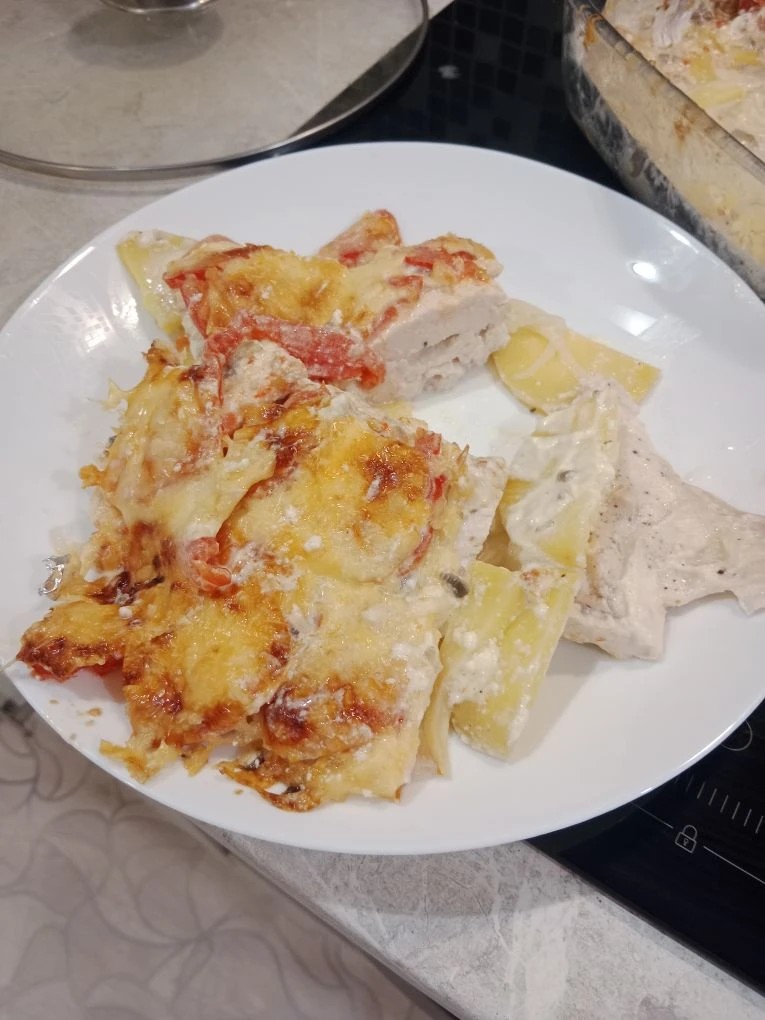Куриное филе получилось нежным, овощи мягкими и вкусными. Майонез придал блюду сочности. А сыр расплавился, скрепил слоя и запеканка не развалилась, когда раскладывала порционно. Отличный совет! Блюдо достаточно сытное и очень вкусное! Рецепт великолепный! Большое спасибо автору!