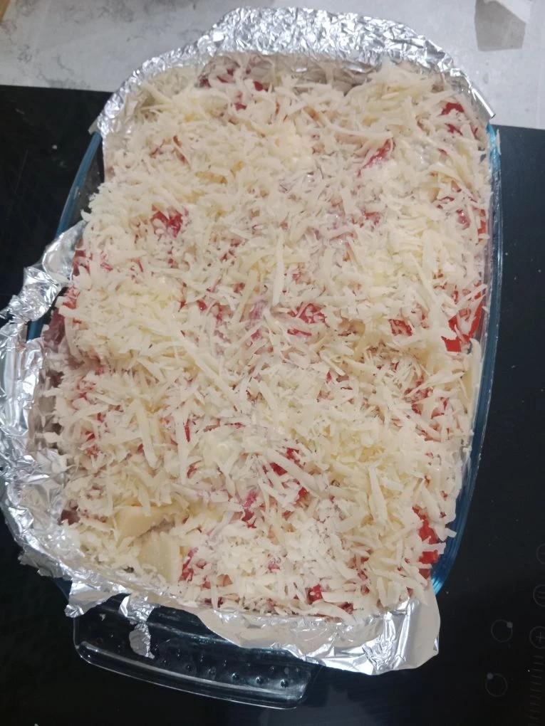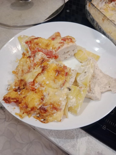 Понравился мне рецепт куриное филе по французски с помидорами. Очень заинтересовало, что сыр кладется между слоями. Решила приготовить блюдо на ужин, но заменила помидоры за неимением оных на сладкий перец. Все продукты обработала по описанию в рецепте. Сыр взяла твердый гайсин, он вкусный и хорошо плавится. Сложила всё в форму слоями, пересыпая тёртым сыром. Запекала блюдо в духовке 45 минут, но картошка не конца пропеклась, поставила ещё на 15 минут. Готовила всего блюдо 1 час. Очень ароматно и красиво вышло! Сладкий перец придал мясу по-французски особый вкус и аромат. Нам очень понравилось)