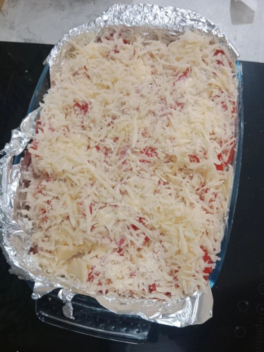 Немного посыпьте тертым сыром. Сыр, добавленный между слоями, при запекании будет плавиться и соединять слои между собой. Благодаря этому, готовое блюдо не будет разваливаться, когда вы будете его раскладывать по тарелкам.