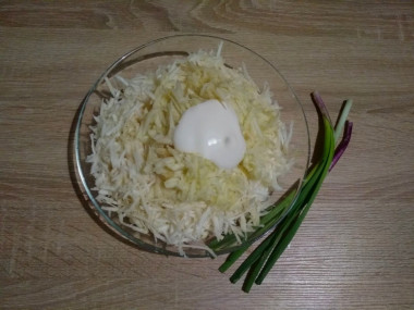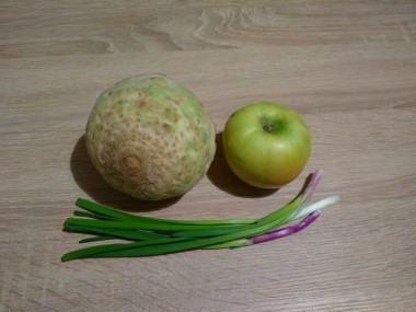 Как сделать салат из корня сельдерея с яблоком? Подготовьте ингредиенты. Майонез можно сделать самостоятельно. Рецепты вы найдёте после последнего шага. Корень сельдерея должен быть не поврежденным, без признаков гнили и плотным. Яблоко так же должно быть свежее, лучше кисло-сладкое на вкус. Чтобы сделать салат мягче на вкус, добавьте отварные яйца, а для остроты немного зеленого лука. А вообще можно добавлять овощи или мясные продукты на ваш вкус.