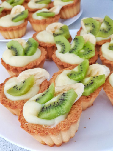 Это одно из простых и в то же время очень вкусных десертов, который не оставит равнодушным никого. Корзиночки готовятся довольно легко, без всяких заморочек. Выпекала песочную основу в силиконовых формах для кексов и получилось очень даже не плохо. Заварной крем получился как всегда - очень вкусным и нежным, но единственное, что я добавила чуть меньше сахара, чем предлагается в рецепте. Украсить песочные корзиночки я решила киви и бананами, что стало прекрасным дополнением к десерту.