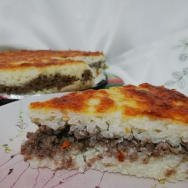 Фарш я сделала сама из куриной грудки и свиной грудинки. В зажарку от себя добавила тертой моркови. Получилось сочно! Рис взяла длиннозерный пропаренный, он отлично подошел для запеканки. Мне понравилась идея предварительно смешать его со сметаной и яйцами. Действительно заливка обволокла каждое зернышко и запеканка получилась цельной как пирог. Запекала я свое блюдо час, т. к. продуктов взяла побольше, чем в рецепте.