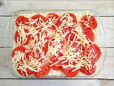Помидоры помойте и разрежьте напополам. Удалите плодоножку и нарежьте помидоры полукольцами. Разложите нарезанные помидоры по всей поверхности запеканки.