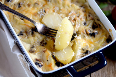 Чудесный рецепт для сытного семейного ужина! Картошка мясо грибы помидоры в духовке по французски - беспроигрышное сочетание ингредиентов для приятной трапезы в кругу семьи. Картошка с фаршем по этому рецепту получаются необычайно аппетитными, сочными и пропитанными овощными соками с ароматом грибов. А молоко и сыр делают это блюдо поистине нежным и деликатным на вкус. Большое спасибо за рецепт!