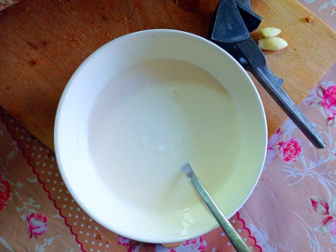 Ряженка у меня была 3,2-процентная, сметана 15-процентная, майонез покупной. Чеснока взяла два зубчика.