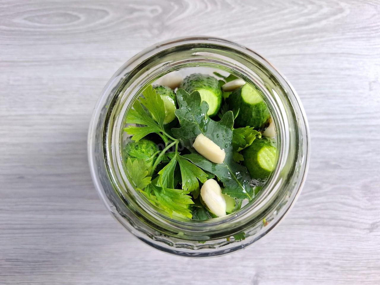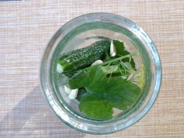 Всю зелень и листочки тщательно промойте в проточной воде и обсушите, выложив на чистое полотенце. Банку хорошо помойте с использованием соды и обдайте кипятком. На дно банки выложите половину зелени и чеснока, затем плотно уложите огурцы. Сверху вложите оставшуюся зелень и чеснок. О том, как рассчитать необходимое количество банок для заготовки читайте в статье по ссылке под описанием рецепта.