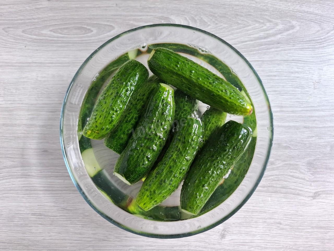 Огурцы хорошо помойте в проточной воде. Нужно ли замачивать огурцы перед засолкой? Лучше это сделать, чтобы огурцы получились хрустящими. Для этого переложите их в глубокую миску и залейте холодной водой. Я обрезала кончики с двух сторон, но можно этого не делать. Оставьте огурцы напитаться влагой примерно на 2–3 часа. За это время огурцы станут более плотными и хрустящими.