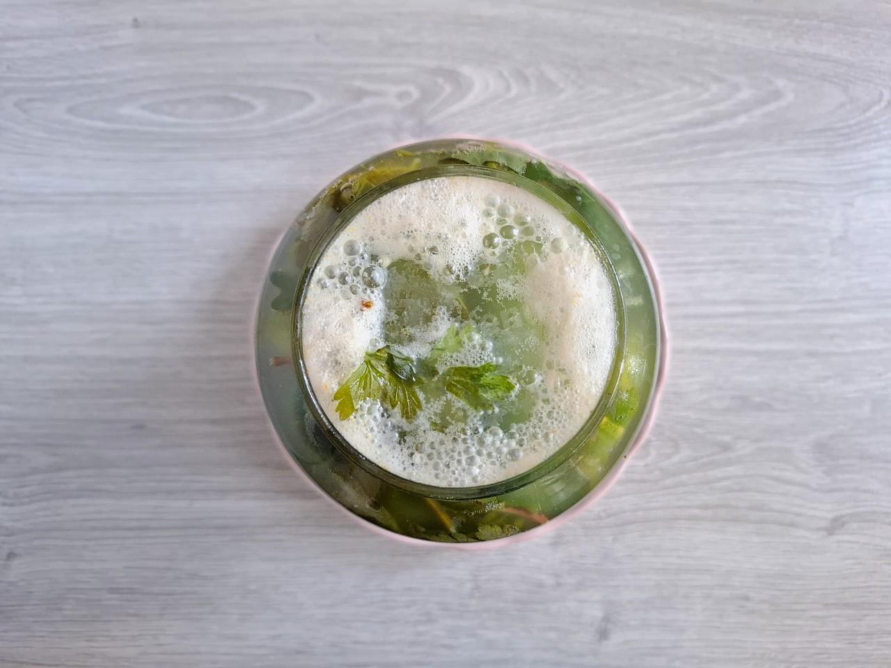 Влейте рассол с горчицей в банку, затем долейте чистую, холодную воду до верха банки. Установите банку в миску или глубокую тарелку и оставьте при комнатной температуре примерно на 2-4 дня. Крышкой накрывать не нужно, т. к. забродивший рассол может выливаться из банки.
