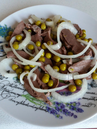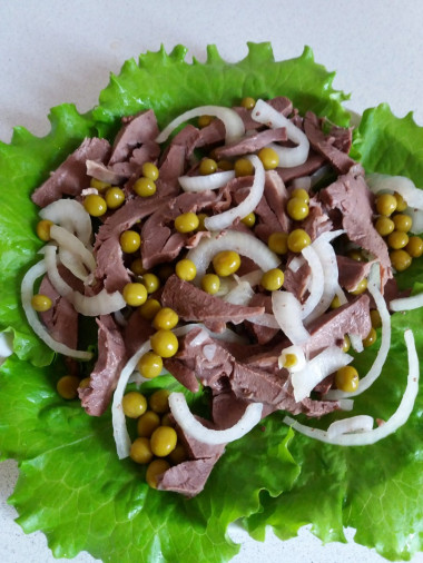 Отварите в подсоленной воде со специями сердце и остудите его. Очистите лук. Слейте воду с зеленого горошка.