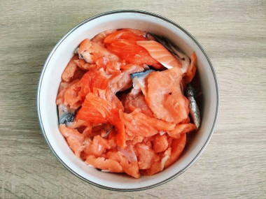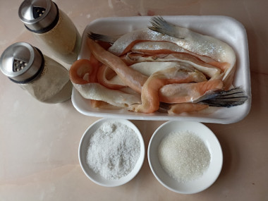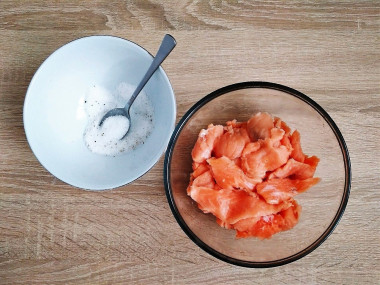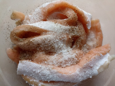 Итак, подробнее. Если вы используете замороженные брюшки, то сначала разморозьте их. Промойте и просушите рыбу. Смешайте соль и сахар, добавьте черный перец (лучше свежемолотый сразу из мельницы), немного присыпьте тмином (не обязательно, это я так люблю). Пересыпьте рыбку посолочной смесью, хорошо перемешайте её.