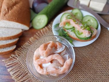 Купила замороженные брюшки и нашла рецепт как засолить брюшки сёмги в домашних условиях. Всё предельно просто. Сначала я их разморозила при комнатной температуре, промыла и обсушила бумажными полотенцами. Сложила в судок, хорошо посолила, добавила сахар, тмин не клала. Оставила в холодильнике засаливаться, периодически перемешивала. Быстро и очень легко. Засоленные брюшки не промывала. Срезала рыбку с солёных брюшек. Батон намазала маслом и выложила семгу. Шикарные получились бутерброды с красной рыбой. Это нереально вкусно. Брюшки сёмги вышли малосольными, сочными и ароматными. Прекрасный рецепт! Большое спасибо)