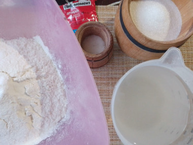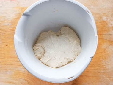 Настает второй этап — замес теста. Кроме муки высшего сорта понадобится немного цельнозерновой муки — ей будем посыпать стол и заготовки. Обратите внимание, что основной муки может понадобится больше или меньше, будете смотреть по консистенции теста.