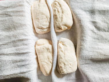 Возьмите пергамент для выпечки. Аккуратно переложите подошедшие заготовки, перевернув их вверх той стороной, на которой они лежали на полотенце — тогда чиабатты приобретут специфический рисунок. Правильно выбрать пергаментную бумагу вы сможете, прочитав отдельную статью про особенности пергамента, ссылка есть в конце рецепта. Перенесите бумагу с заготовками в духовку на разогретый противень.