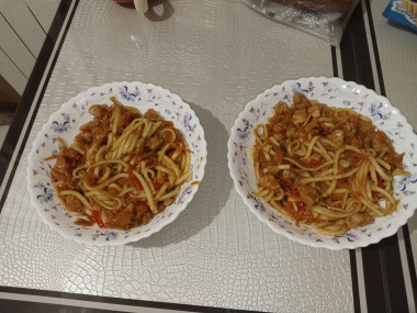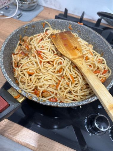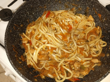 Потом выложите лапшу в сковороду к тушеным овощам и куре, хорошо перемешайте все и протушите еще 3-4 минуты на слабом огне. Попробуйте лапшу на вкус, при необходимости добавьте еще немного соли в блюдо, после чего снова его перемешайте.
