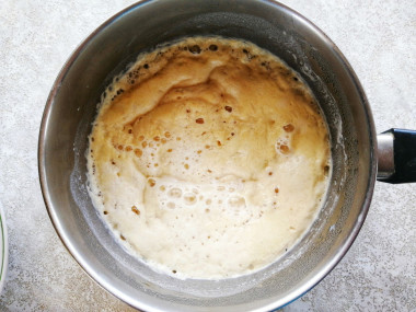 Замешивала тесто опарным способом на молоке. Сделав опару, поставила ее в теплое место. Через час опара увеличилась в 2,5 раза, на поверхности образовались большие пузырьки.