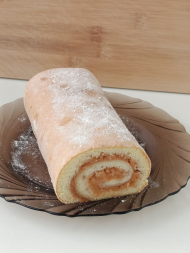 . Делала на половину порции, для начинки взяла 2 яблока. Но на вид, будто начинки многовато, может, поэтому так свернулся. Но на вкус это не повлияло, рулет о-очень вкусный