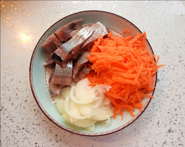 Возьмите контейнер, сложите на дно нарезанные лук и морковь, сверху выложите кусочки сельди.