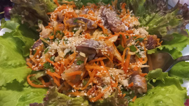 Необычная закуска Селедка хе по корейски , украшает любой стол. Яркая морковь и свежая зелень, придают дополнительные краски, серой селёдочки, делая её праздничной, оригинальной. Я добавляла петрушку, т.к. кинзу не люблю. Очень вкусно, сочно, пикантно, а самое главное - легко и просто!