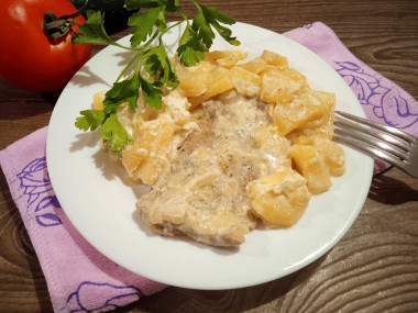 Решила готовить свинину с картофелем в духовке и мне понравился этот рецепт. Мясо по капитански в духовке с картошкой новогоднее можно сделать на любой праздник) Вот я и приготовила на праздничный ужин мясо по-капитански, только без сыра за неимением оного. Картошку порезала тонкими полукружочками. У меня задняя часть свинины была, порезала на отбивные и отбила молоточком. Смешала майонез со сметаной. Лук порезала полукольцами.