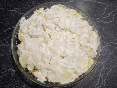 Вот только не понятно, распределять сыр со сметаной-майонезом есть какой нибудь способ, чтобы картошка не липла к ложке, или нет?