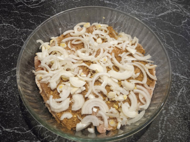 Выложите мясо поверх лука. Лучше, если оно будет лежать в один слой, поэтому рассчитывайте, какого размера брать форму под ваше количество мяса.