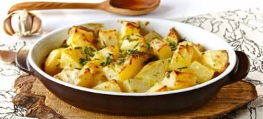 Запекайте мясо с картошкой в духовке при 180 градусах 50-60 минут. Готовность определите по готовности картошки — она должна стать мягкой и легко протыкаться ножом. Сверху при этом образуется румяная корочка. Если картошка еще не готова, а мясо уже сильно зарумянилось сверху, накройте форму фольгой и пеките до готовности.