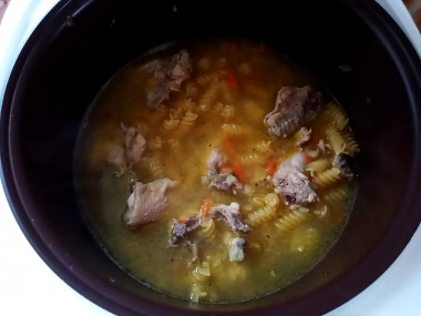 4. Готовьте макароны с курицей на режиме Паста до полного впитывания жидкости. Иногда перемешивайте. Приправьте по вкусу.