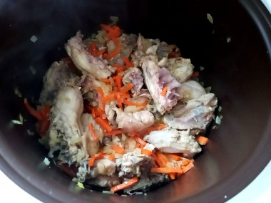 Кусочки курицы у меня были подготовлены заранее, это были части спинки, ребра и шея. Лук нарезала кубиками, а морковь крупными брусочками. Жарила все это в мультиварке 20 минут. Для аромата и пряного вкуса добавила приправу для курицы. Потом всыпала макароны (400г.), перемешала и залила горячей водой, как и указано, вровень. Дальше готовила на режиме "крупы". Время там не выставляется, но по окончании программы почти вся жидкость впиталась в макароны. При этом образовался вкуснейший обволакивающий соус! Макароны не развалились, сохранили форму. Тут, наверное, имеет значение качество макарон. У меня были итальянские из твёрдых сортов пшеницы.