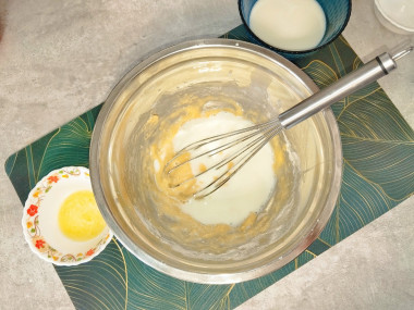 Влейте половину молока, перемешайте венчиком тесто до однородности. Затем всыпьте оставшуюся муку, снова перемешайте. И влейте вторую половину молока. Тесто получится однородное, по консистенции как жидкий питьевой йогурт.