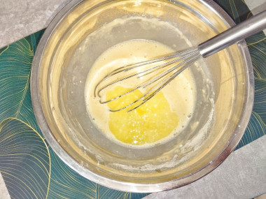 Добавьте в тесто растопленное сливочное масло. О том, как растопить масло читайте в конце рецепта. Перемешайте тесто.