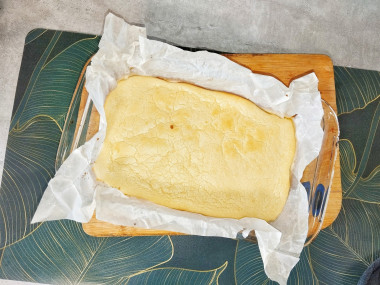 Возьмите противень (у меня 30*40см) и застелите его пергаментом. Пергамент берите силиконизированный — к нему блин не прилипнет. Вылейте тесто на противень и равномерно распределите его. О том, какой лучше выбрать пергамент читайте в статье, ссылка под шагами.