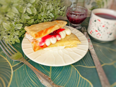 Готовится всё элементарно: смешиваются необходимые ингредиенты, тесто выливается на противень и отправляется в разогретую духовку у меня вышло полчаса. После выпечки готовый горячий блин разрезается на кусочки, смазывается любимым кремом (у меня был оставшийся после приготовления торта), сверху выкложила немного малинового варенья. Получилось невероятно сытно и вкусно! Раньше подобного блюда я ещё не пробовала, результат превзошёл ожидания.