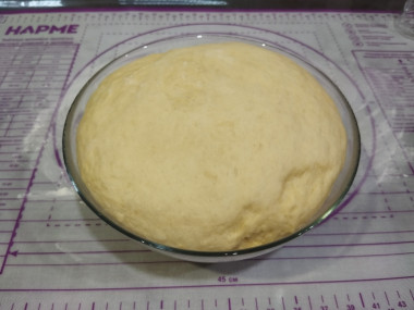 Учтите, что на подъем теста может уйти больше или меньше времени. Точное время зависит от температуры в помещении и активности дрожжей. Проверяйте периодически, как тесто поднимается. Если ваше тесто увеличилось в 2.5-3 раза - приступайте к раскатке. Если нет, то придётся ещё подождать. Подошедшее в 2,5-3 раза тесто обомните и раскатайте в тонкий пласт толщиной около 1 см. Стаканом или другой подобной посудой вырежьте из теста кружочки диаметром 8-9 см.