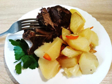 У меня было около килограмма мяса оленины с косточками, в основном лопатка. Мясо свежее, но олень не молодой. Стала искать на сайте, что можно приготовить из такого мяса, и нашла этот рецепт с чудесными советами. Вымачивала, промариновала и прожарила, как советует автор. От себя добавила немного специй (по щепотке хмели-сунели, молотый кориандр и орегано). Запекала с овощами (без лука), но дольше - около 1,5 часов только мясо в форме с закрытой крышкой, а затем около часа с овощами. Получилась песня, а не оленина!! Никакого запаха, мясо нежнейшее, прям рассыпается на кости! Очень вкусное! И картошка, кстати, тоже вкусная вышла. Рецепт рекомендую!
