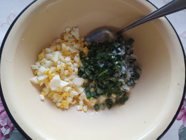 Начинка для пирожков и пирогов с луком и яйцом очень мне пригодилась. Захотела испечь пирог с яйцами в начинке и нашла замечательный вариант начинки для пирога. Сделала четко всё по рецепту, готовить проще простого. Яйца отварила заранее. Нарезала кубиками, мешала с зелёным луком, посолила, потом влила растопленное масло и размешала.