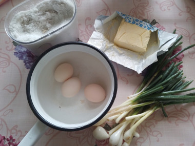 Как сделать начинку для пирожков и пирогов с луком и яйцом? Для начала подготовьте все необходимые ингредиенты для приготовления начинки. Масло достаньте из холодильника заранее, чтобы оно стало мягким. Зеленый лук переберите, сполосните и разложите на полотенце, чтобы вода стекла и он просох. Яйца отварите на среднем огне в течение 12 минут, после закипания, остудите в холодной.
