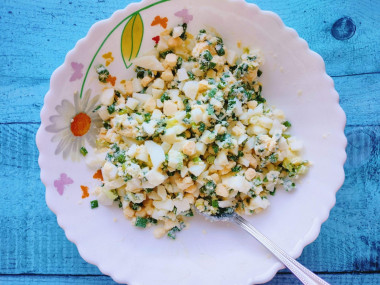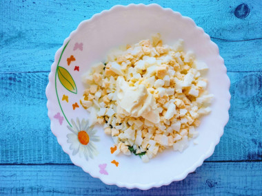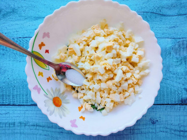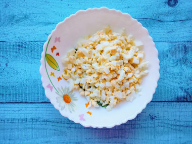 У остывших яиц разбейте скорлупу и дайте полежать в воде примерно 5 минут. За это время вода просочится под пленку скорлупы, и вы без проблем их очистите. Яйца измельчите любым способом. Их можно мелко или крупно порубить ножом или натереть на крупной терке и добавьте в миску с луком.