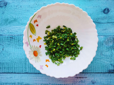 Обсушенный лук мелко порежьте острым ножом или измельчите при помощи кухонных ножниц. При таком способе он не мнется и не дает сок. Положите его в миску.