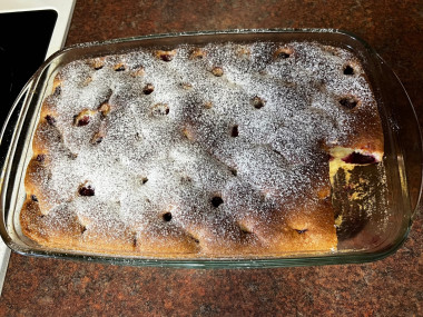 Сверху выкладываем вишню (если вишня заморожена, нужно ее выжать от лишнего сока). Выпекаем при температуре 180 градусов 35 минут. Готовность проверяем деревянной палочкой или ножом.