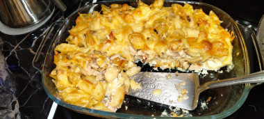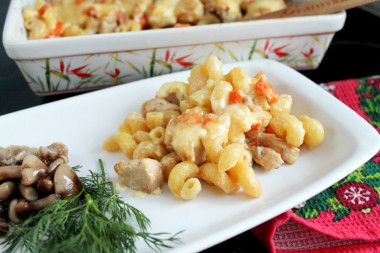 Макароны с курицей в духовке запеченные с сыром - это запеканка в сметанном соусе под сырной корочкой. Хорошее, полноценное блюдо для всей семьи, которое к тому же легко готовится.