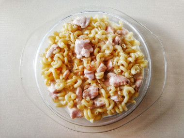 Макароны необходимо заранее отварить. Для этого опустите их в кипящую воду и варите согласно инструкции на упаковке. Подсолите. Макароны должны стать мягкие. Откиньте их на дуршлаг и промойте холодной водой. Оставьте, чтобы с них стекла вся вода.