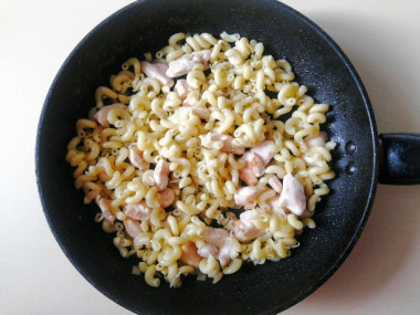 Затем смешайте обжаренную курицу с макаронами.