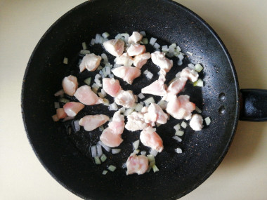 Лук очистите от шелухи, ополосните и нарежьте не очень мелко. Куриное филе нарежьте небольшими кусочками. На горячую сковороду налейте немного растительного масла и выложите нарезанный лук. Следом добавьте к нему нарезанное куриное мясо.