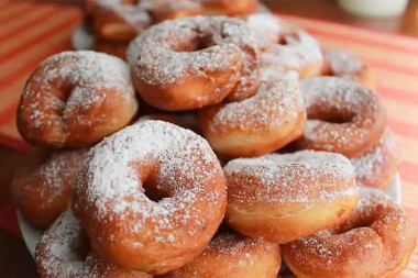 Жареные творожные калачики присыпьте сахарной пудрой, переложите на блюдо и подайте к столу. Приятного аппетита!