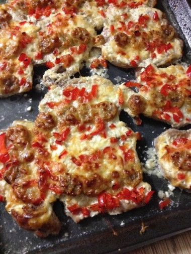 Очень вкусное мясо! Грибы с луком, помидоры, брынза, и никакого майонеза не надо. Мне показалось, что даже само мясо мягче обычного, возможно, из-за кислоты помидор, которая выступила в качестве маринада.