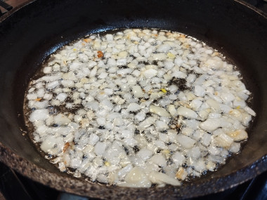 На сковороде разогрейте растительное масло. Масло может быть любым: недорогим подсолнечным или дорогим оливковым,но т.к. мы будем на нем жарить, оно обязательно должно быть рафинированным, чтобы не пригорать на сковороде. Добавьте нарезанный лук и обжарьте его до золотистого цвета около 5-7 минут.