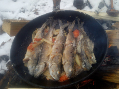 6. Обжаривайте рыбу по 4-7 минут с каждой стороны до румяной корочки. Длительность обжаривания, зависит от величины тушек хариуса.