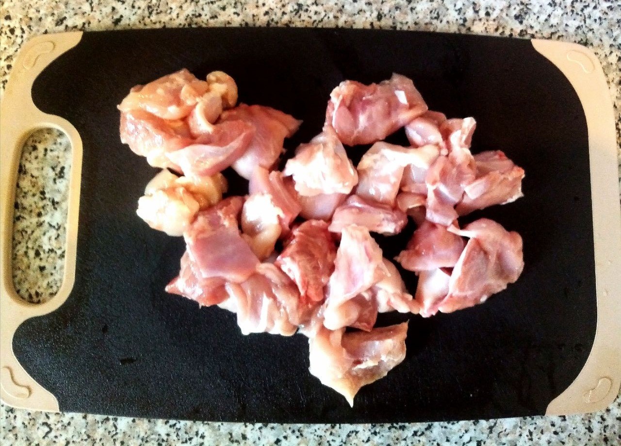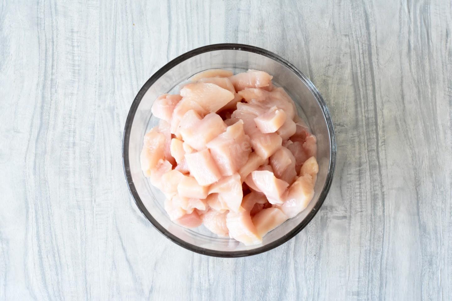 Куриное филе вымойте, обсушите и нарежьте небольшими кусочками. Курицу можно заменить на индейку или на любой другой вид мяса по вашему желанию. Но учтите, что в таком случае время приготовления и калорийность блюда изменятся.