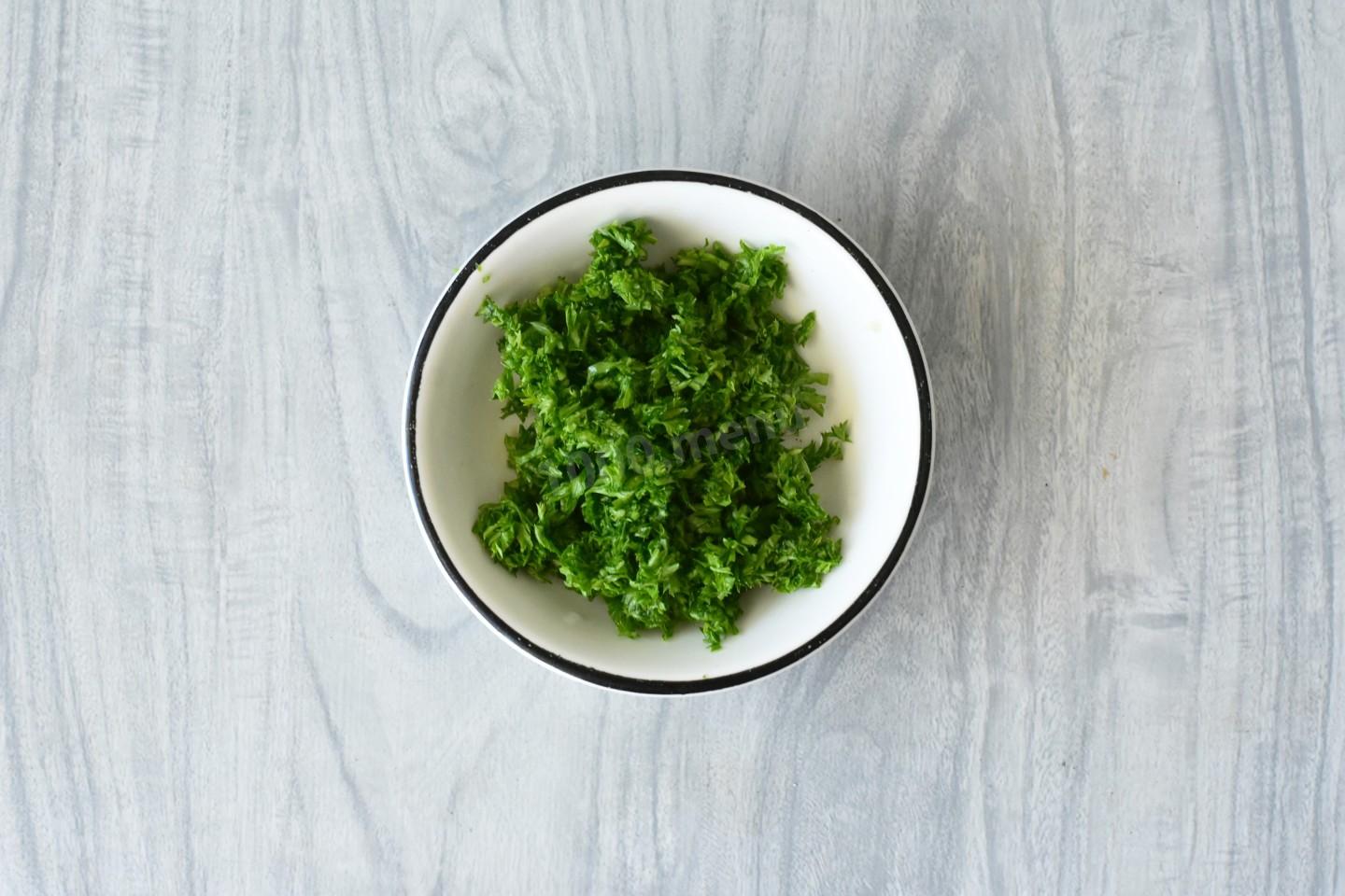 Петрушку ополосните, отряхните от влаги и мелко порубите. По желанию можете заменить или дополнить другой зеленью, например, кинзой, укропом, зеленым луком или использовать смесь разных трав.