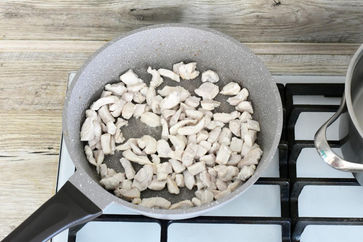 В сковороде на сильном огне разогрейте растительное масло. Выложите курицу и обжарьте, помешивая, до румяной корочки 5-7 минут. О том, как подобрать идеальную сковороду и растительное масло, читайте по ссылкам в конце рецепта.